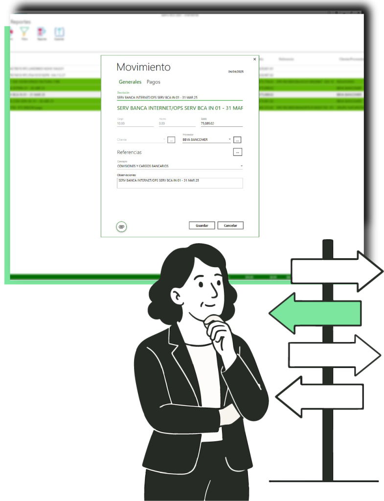 Visualiza el origen y destino de cada operación bancaria de forma clara. Genera reportes personalizados por fecha, cuenta, concepto o clasificación, que te ayudan a entender mejor tus ingresos y egresos.